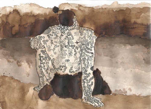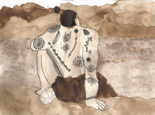 Parallèlement à l'étude de l'album Les derniers Géants de François Place, les élèves ont inventé des tatouages pouvant figurer sur la peau des neuf titans. Avant cela, un travail au brou de noix pur puis mélangé à de la gouache ont permis de représenter les aspérités du relief et la couverture nuageuse.